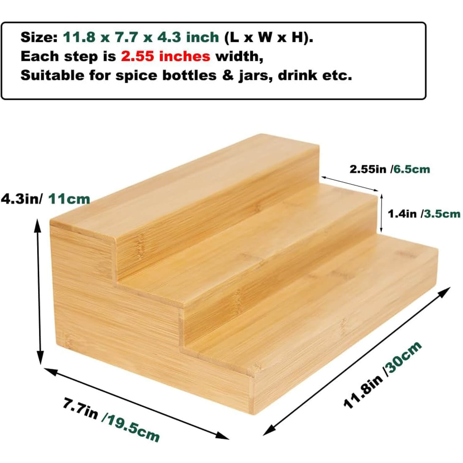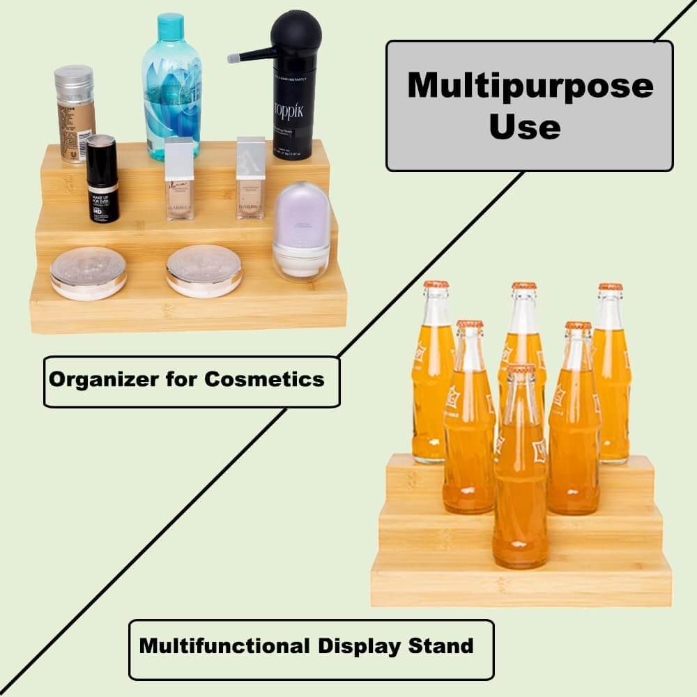 Versatile Organizer :The 3-tier step design (each step 2.5 inches wide) maximizes storage, holding 12-18 spice jars。The bamboo spice rack also can organize essential oils, cosmetics, lipstick, nail polish and perfumes. And used as a display shelf for collectibles like figurines, toys, rock and curios.