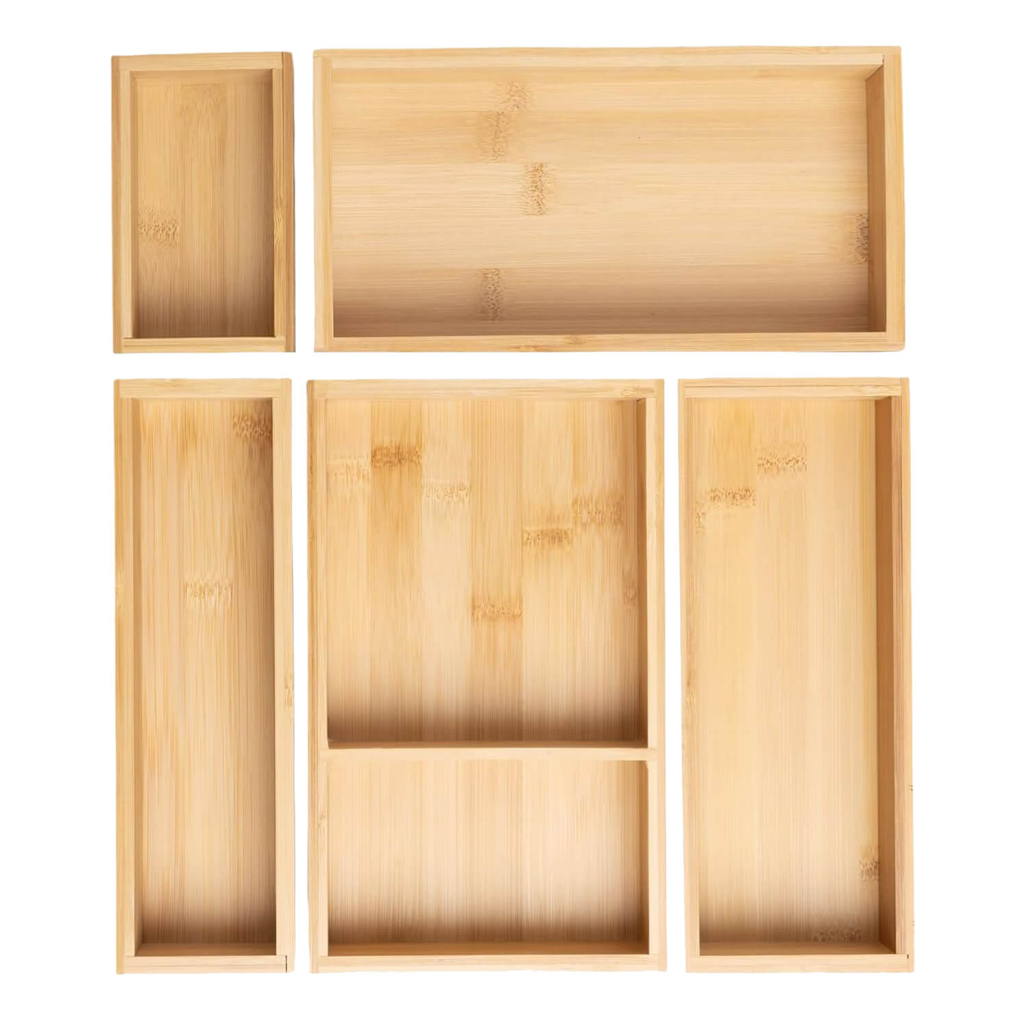 VERSATILE BAMBOO DRAWER ORGANIZER SET: This 5-piece bamboo drawer organizer set includes five separate wooden junk drawer organizers, perfect for organizing office supplies, kitchen utensils, silverware, makeup, tea bags, and jewelry in any room of your home.