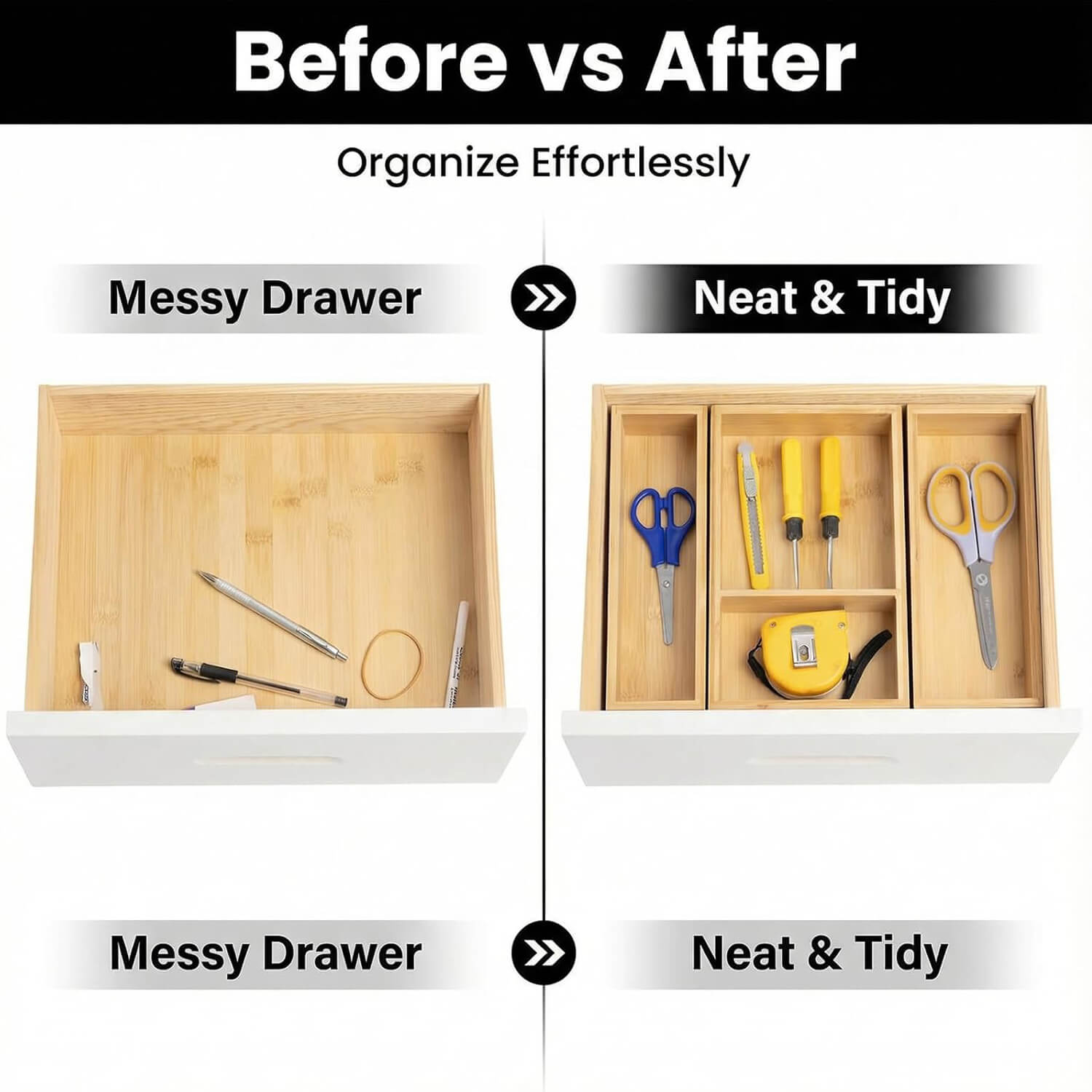 STYLISH DESIGN: Crafted from durable, sustainable bamboo, these wooden drawer organizers offer a sleek and natural look, ideal for keeping your drawers tidy in the kitchen, bathroom, dressing table, or workspace.
