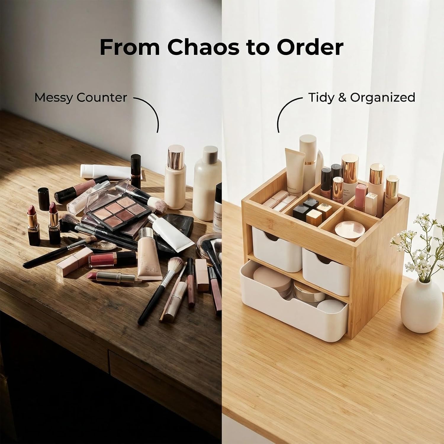 Ninebendstreams Bamboo Makeup Organizer with 3 Drawers, Dresser Cosmetic Organizer Box,Bamboo Desk Organizer for Home with Adjustable Dividers